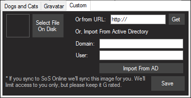 And Custom which allows selecting images on disk, from a url, or from Active Directory. In all cases images will be resized and possibly stretched if they are not already square.
