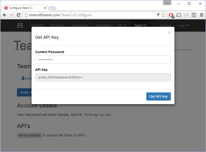 Then type your password, click the button and copy the resulting API Key.
