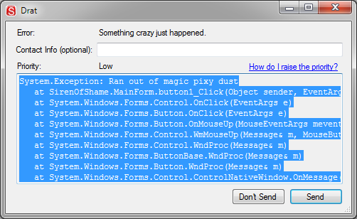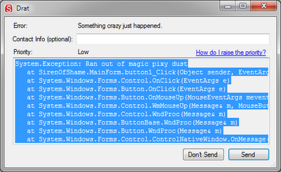Unless we see a large number of similar errors we typically prioritize anything submitted via the in-app dialog as low. In other words we probably won’t get to it any time soon. For the fastest response we love patches and a pull requests. But we’ll also get right on that if you submit the bug via Google Code over here: